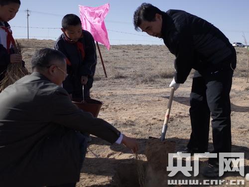 內(nèi)蒙古阿拉善盟盟委書記云喜順與小學(xué)生一起種下梭梭樹苗(央廣網(wǎng)記者 金建軍 攝)