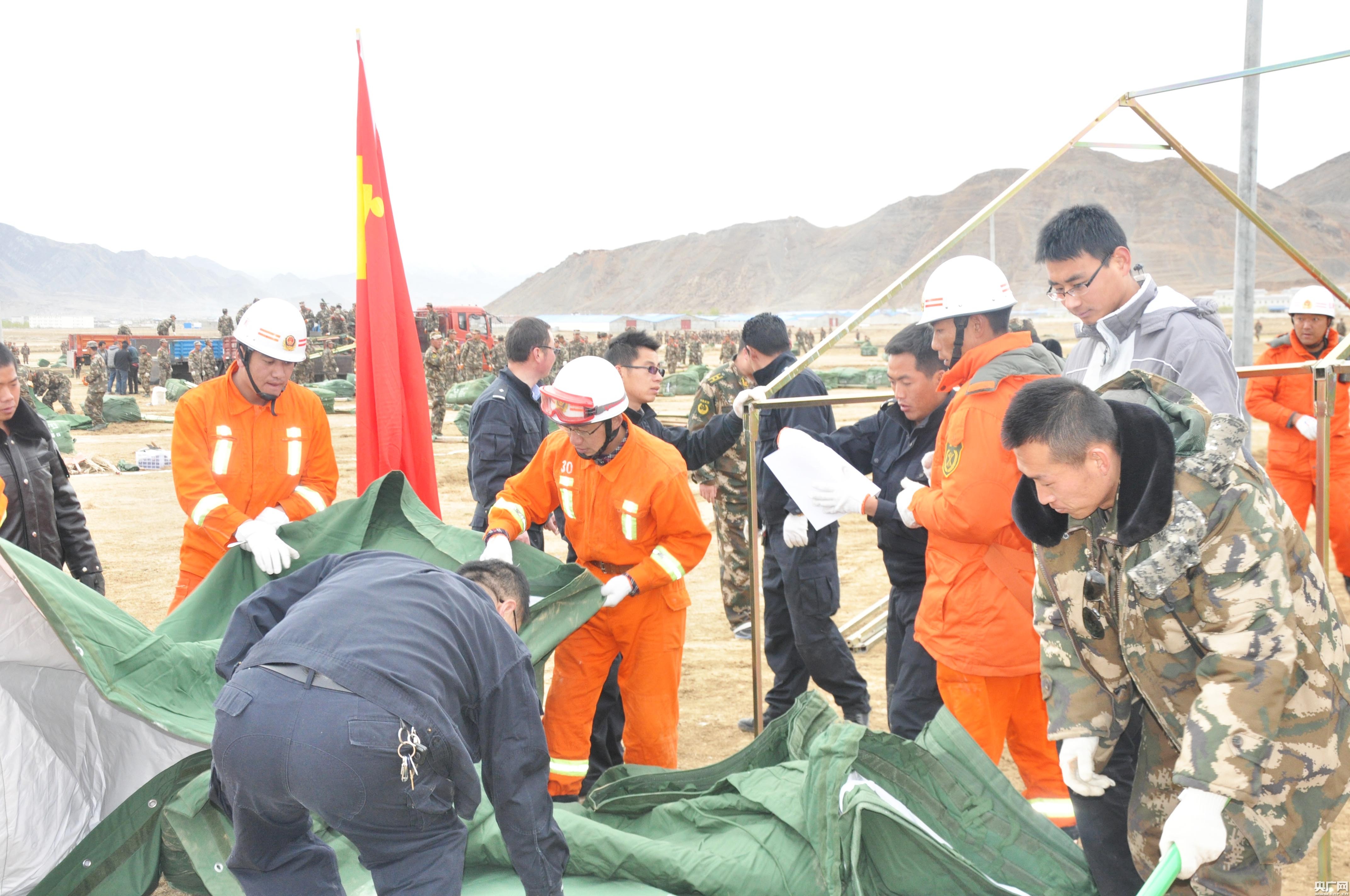 西藏消防總隊官兵正在搭建轉移安置帳篷(西藏消防總隊供圖)
