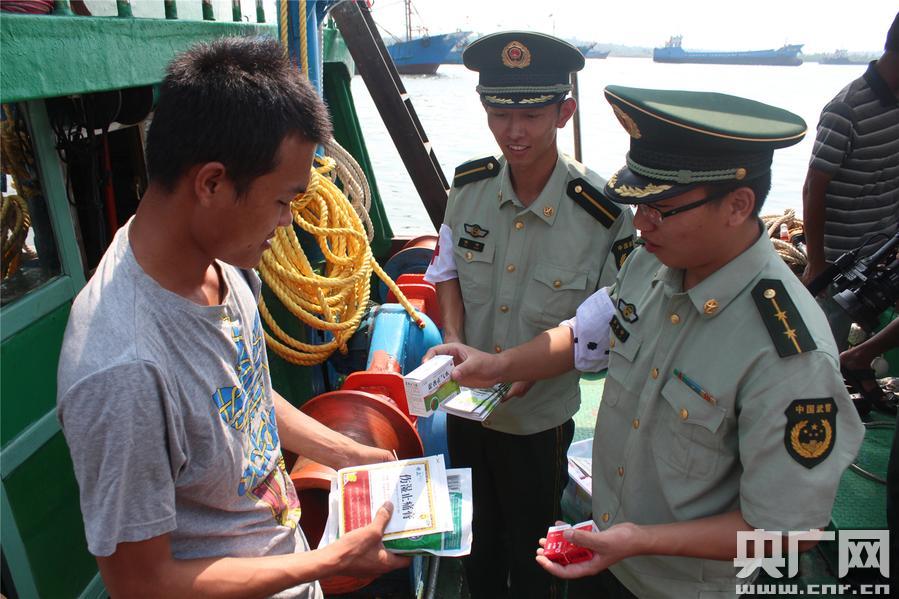 在世界紅十字日來臨之際,海警三支隊醫(yī)療小分隊來到清瀾港環(huán)球碼頭,軍醫(yī)和衛(wèi)生員登上漁船并發(fā)放健康手冊,為轄區(qū)漁民測量了血壓、血脂和血糖。此外,海警官兵還結合船上生活情況,向漁民講解防疾、健康保健等方面的基本常識,提高他們的科學防病意識和能力。此次活動共為漁民體檢167人,贈送了云南白藥氣霧劑、傷濕止痛膏和復方甘草口服溶液等藥品價值1000元,發(fā)放健康手冊260份,真正為漁民架起了一座健康之橋,增進了警民魚水情,得到轄區(qū)漁民一致好評。
