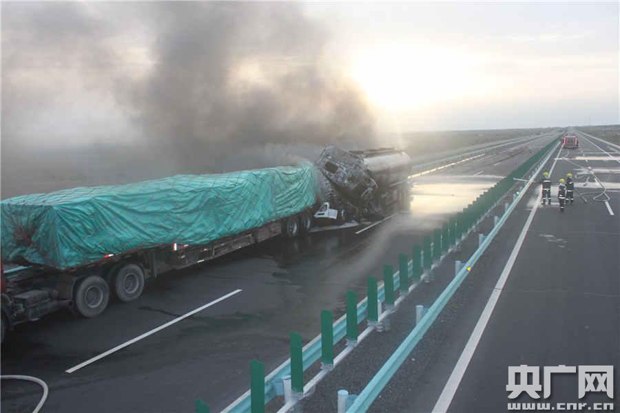 央廣網精河6月13日消息(記者張雷 通訊員賀桂景 陳熙)昨天凌晨6時17分,新疆博爾塔拉蒙古自治州消防支隊119接警中心接到報警:G30連霍高速3961路段精河往伊犁方向一油罐槽車與重型半掛車追尾起火,內有高標號甲醇50.4立方米,火勢猛烈,嚴重威脅到僅距50余米?寇囕v以及下車圍觀群眾。