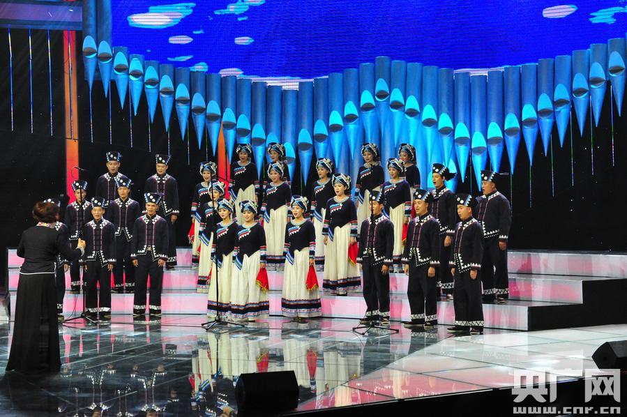 文山壯族坡芽合唱團奪中央電視臺《歌聲與微笑——合唱先鋒》總冠軍,圖為比賽現(xiàn)場。