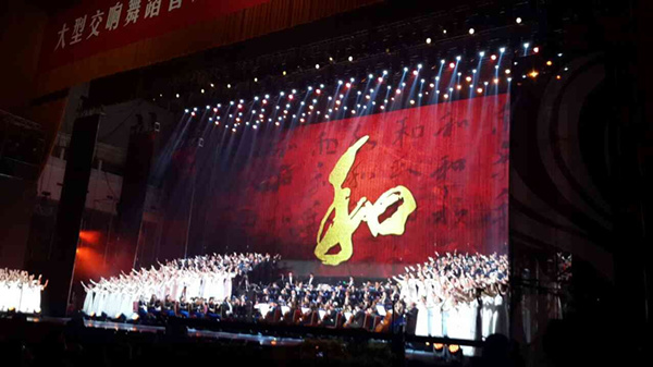 《和平頌》的音樂部分極具特色。六首原創(chuàng)歌曲、五首抗戰(zhàn)歌曲、十七段舞蹈音樂,以及大量的朗誦背景音樂,均緊扣世界反法西斯戰(zhàn)爭和中國反法西斯戰(zhàn)爭兩大主題,既突出世界各國的異域音樂風(fēng)情,又強(qiáng)調(diào)了中國民族音樂的傳統(tǒng)特色,同時各部分在藝術(shù)表現(xiàn)上達(dá)到和諧統(tǒng)一。比如,舞蹈《奧林匹克》中采了古希臘的音樂元素,以一些非常古老的、原生態(tài)的音樂素材為原型進(jìn)行藝術(shù)創(chuàng)作,體現(xiàn)出濃郁的古希臘音樂風(fēng)格。在作品的各個章節(jié)中,使用二胡、竹笛、琵琶、中阮、古箏、板鼓等中國民族樂器,展現(xiàn)中國傳統(tǒng)音樂的感染力。如第三幕,在交響樂隊的襯托下,竹笛、琵琶作為領(lǐng)奏,能讓觀眾感受到晉冀魯豫抗日根據(jù)地的濃郁地域色彩和偉大的軍民抗戰(zhàn)情懷。又如第四幕中的“水袖”,板鼓的加入,使水袖音樂更加民族化,與青衣的舞蹈更為融合,展現(xiàn)出民族音樂和民族舞蹈的特點。整場演出的音樂風(fēng)格變幻,卻能夠保持藝術(shù)表現(xiàn)的和諧統(tǒng)一。