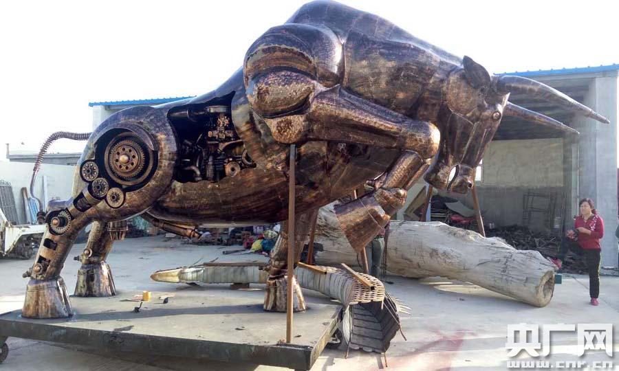 提及設計初衷和制作過程,景逸雕塑負責人許高鵬告訴記者:“因為我們知道江蘇華西村有一個金牛,美國華爾街也有一個牛。我們想呼圖壁縣本來就是中國牛鄉(xiāng),以牛這個主題,我們討論了一下,最后定下來就是一種拓荒牛的造型。完了之后我們就去廢品收購站買了許多廢鐵,廢鋼板之類的材料。從牛蹄開始,所有的鋼板都是我們用手工用榔頭一下一下敲出來的。當時就想用廢舊零件去做,一方面是廢物利用,一方面是節(jié)能環(huán)保!