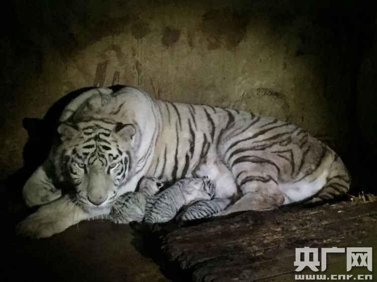25日凌晨,這只白虎就顯得焦躁不安,不斷在虎舍里踱步,一個(gè)小時(shí)后白虎媽媽身體弓著,不斷用力抖動(dòng),不一會(huì),虎媽媽的身下冒出一灘血,第一只小老虎像一個(gè)肉球一樣出來了。虎媽媽用爪子將虎崽撥到了自己的面前,將小老虎身上的胎衣弄破,用舌頭將小老虎身上的羊膜和羊水一點(diǎn)一點(diǎn)的舔干凈。值班飼養(yǎng)員和獸醫(yī)一直在旁觀察著虎媽媽的狀況。由于白虎媽媽先前生過3次寶寶,所以相當(dāng)有“經(jīng)驗(yàn)”,2個(gè)小時(shí)就把寶寶全部生下來了。記者從飼養(yǎng)員那里了解到,這5只小老虎生下來的時(shí)候身體健康良好,沒多大一會(huì)兒就吃上了母乳。