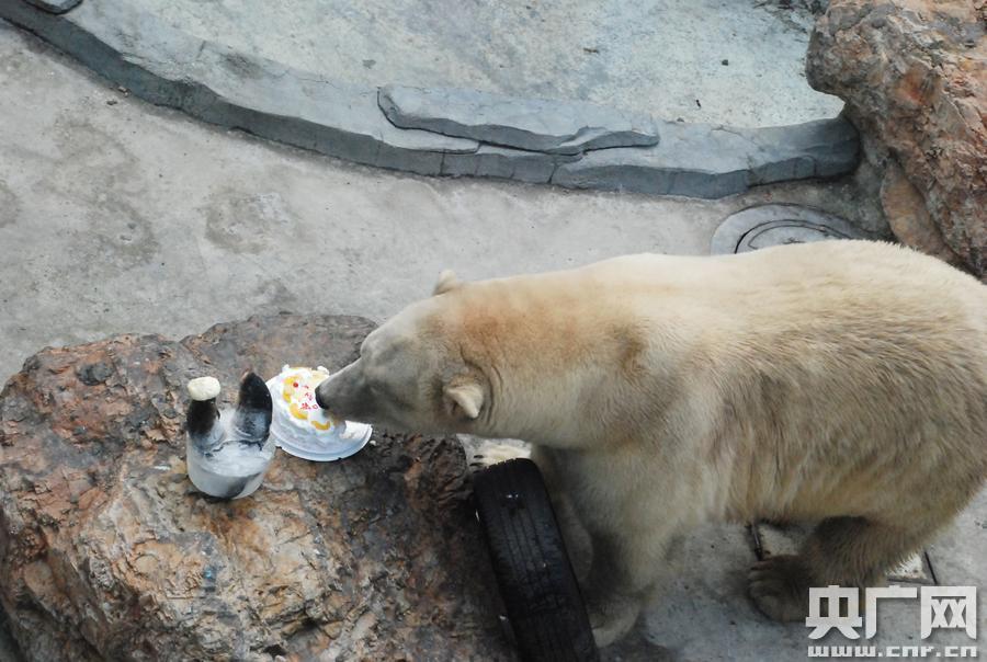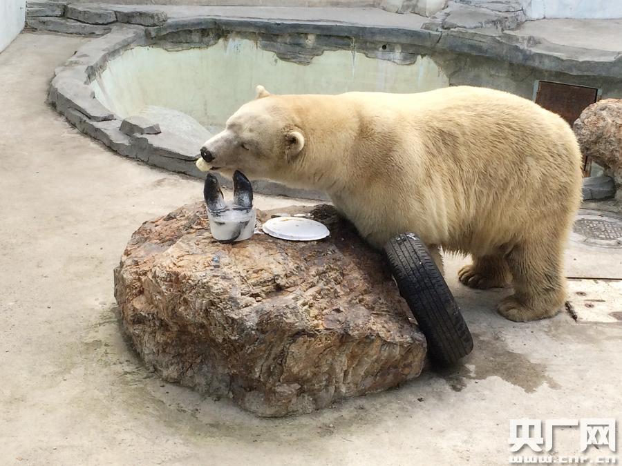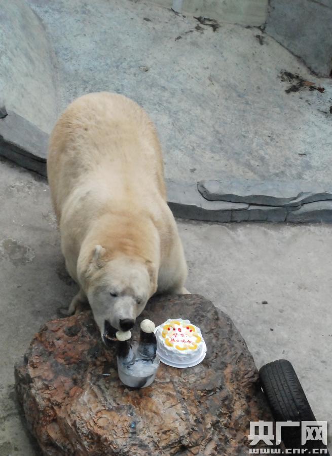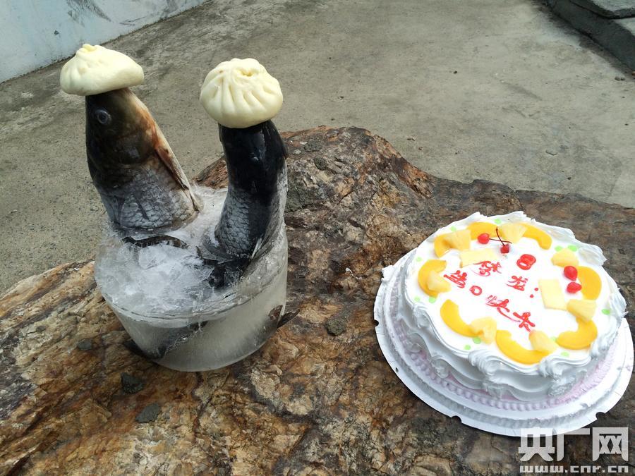 在飼養(yǎng)員把蛋糕和玩具放入運(yùn)動場內(nèi)時,“夢龍”已經(jīng)躍躍欲試了。門一開它急忙跑到了蛋糕前面,先是聞了聞后來還是直接吞掉了一個大包子。然后開始進(jìn)攻奶油蛋糕,剛開始只是用舌頭舔舔,當(dāng)舔到露出蛋糕時就開始大口大口的吃了起來不到5分鐘吃的干干凈凈,最后還不忘舔舔盤子!皦酏垺彼坪鯇﹄p魚蛋糕并不太感冒,直到把另一個大包子吃掉后,才心滿意足的離開。去玩它的新生日禮物——大輪胎。