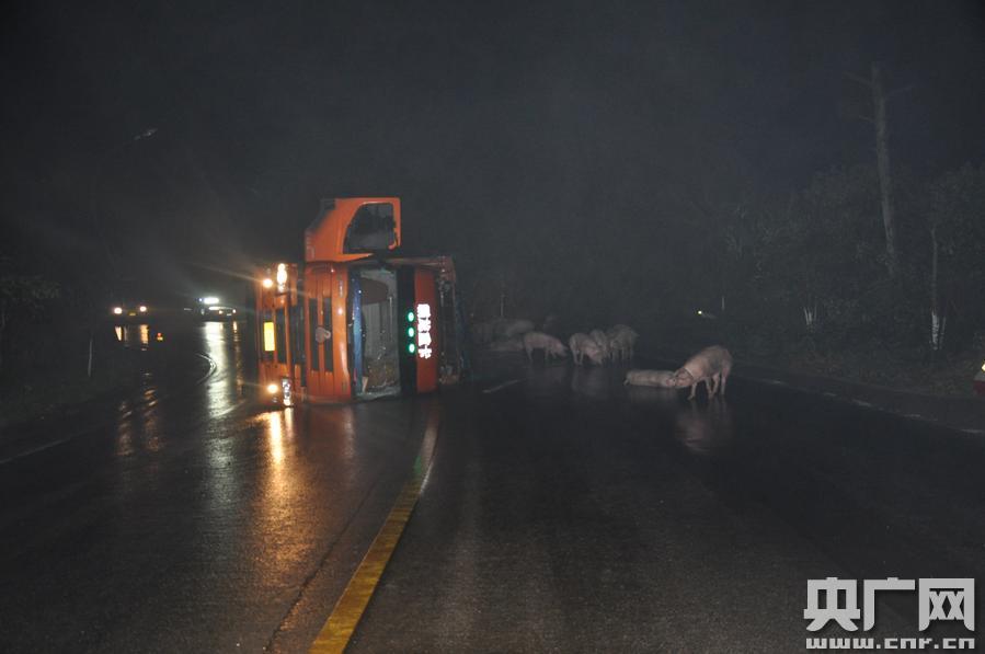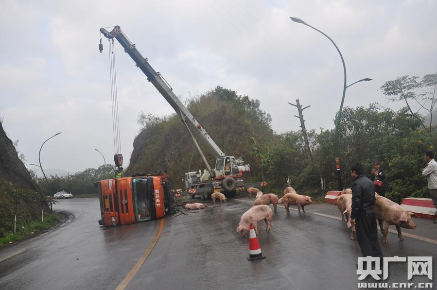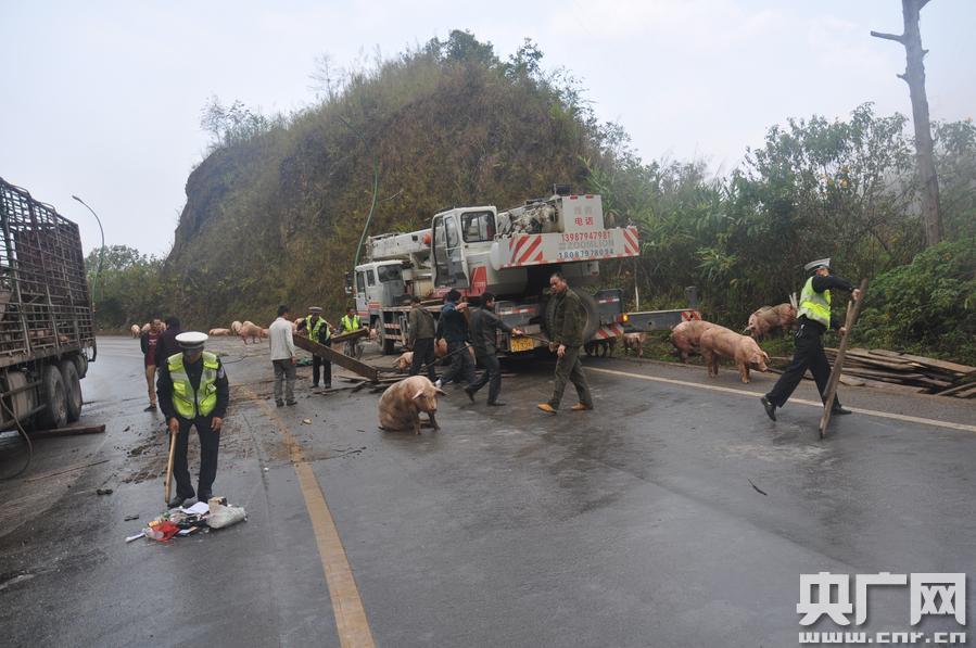 經(jīng)過1個(gè)多小時(shí)的現(xiàn)場(chǎng)救援處置,翻倒的貨車被清出了道路,161頭生豬在民警的看管下也完好無損,無一丟失。