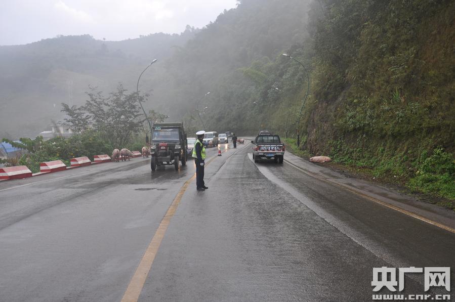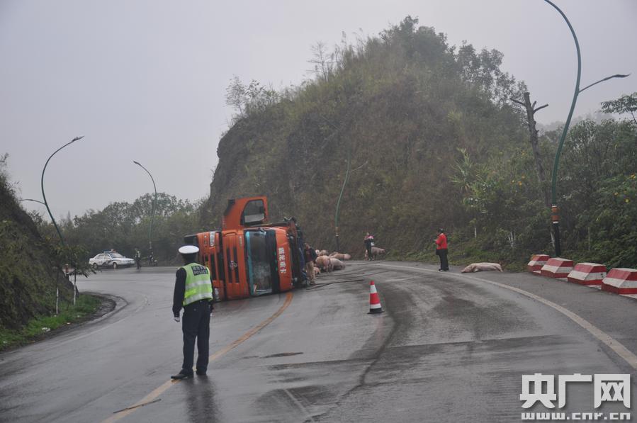 當(dāng)天清晨,瀾滄縣公安局交警大隊(duì)惠民中隊(duì)民警驅(qū)車在轄區(qū)進(jìn)行巡邏,當(dāng)巡邏到西景線K3012處時(shí),發(fā)現(xiàn)一輛翻倒的重型貨車占據(jù)了道路中央,一頭頭生豬在道路上四下奔跑,嚴(yán)重影響了道路交通秩序,驚魂未定的貨車駕駛員付某站在一旁手足無措。經(jīng)詢問,付某駕駛著載滿161頭生豬的重型貨車從景洪市向?yàn)憸婵h方向行駛,當(dāng)行駛至西景線K3012處在下坡轉(zhuǎn)彎過程中,因道路濕滑,車輛控制不穩(wěn),導(dǎo)致車輛沖出路面后與山墻發(fā)生碰撞,致使車輛翻倒在道路中間。