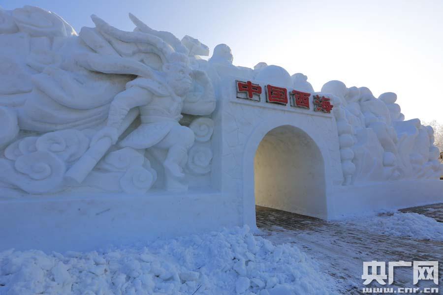 央廣網(wǎng)庫(kù)爾勒1月14日消息(記者吳卓勝 巴州臺(tái)記者熊光偉 茍秀君)新疆巴州博湖縣博斯騰湖大河口景區(qū)的27座冰雪雕現(xiàn)已全部竣工,其中最大、最震憾的雪雕要屬佇立于景區(qū)大門(mén)“金猴迎春”雪雕,該雪雕長(zhǎng)18米、高6米、寬6米。
