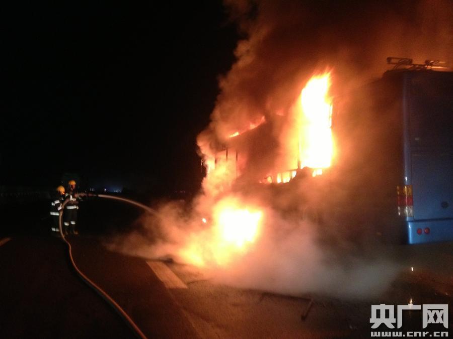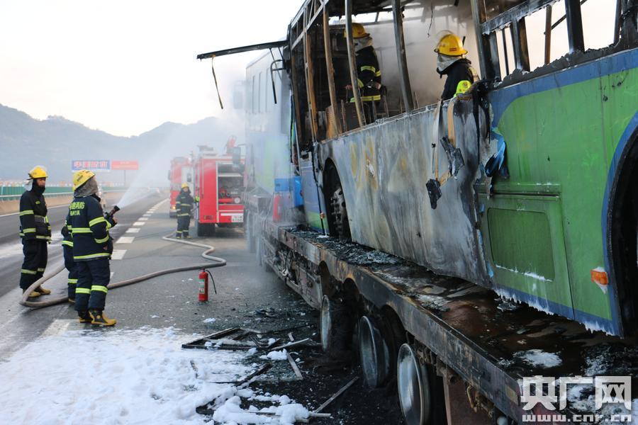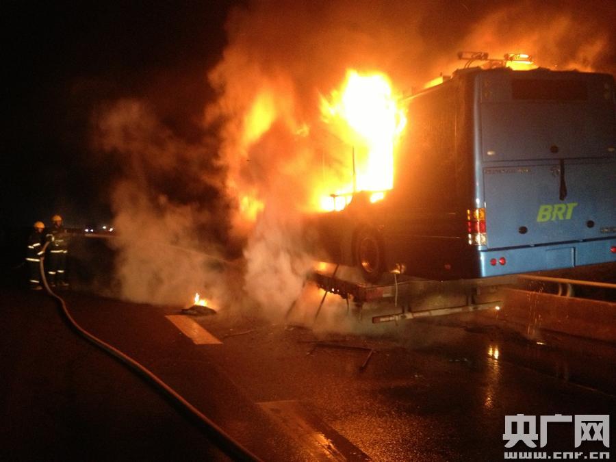接警后,福州市消防指揮中心立即調(diào)集連江縣消防大隊(duì)鳳城中隊(duì)的兩部消防車和10名消防官兵,會(huì)同高速交警和路政部門趕到現(xiàn)場進(jìn)行處置。到場時(shí),兩輛車身標(biāo)有BRT字樣的公交車不同程度過火,其中一輛幾乎被大火吞噬,另一輛也已經(jīng)被引燃。截止當(dāng)日清晨7時(shí)30分許,明火被徹底撲滅。