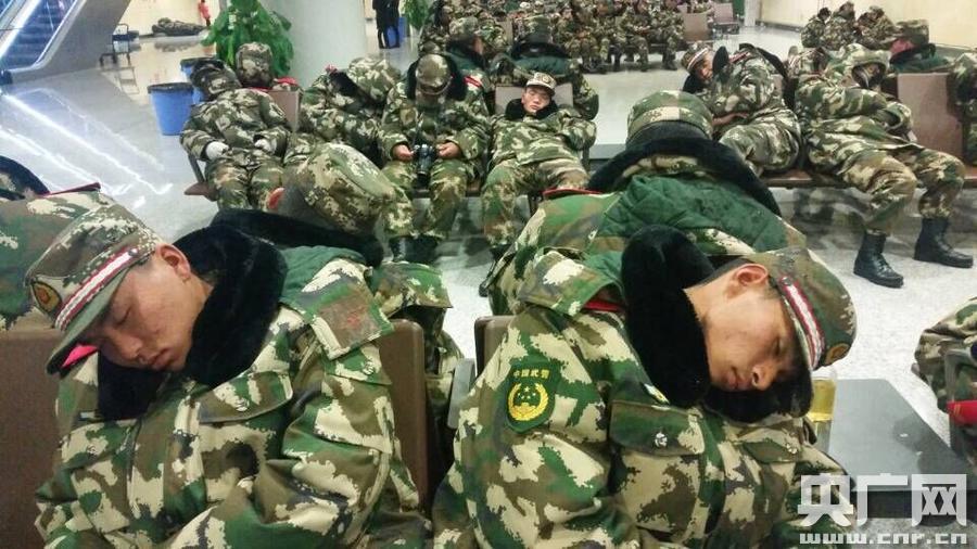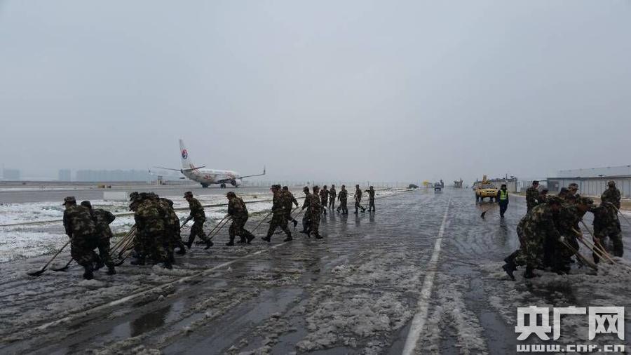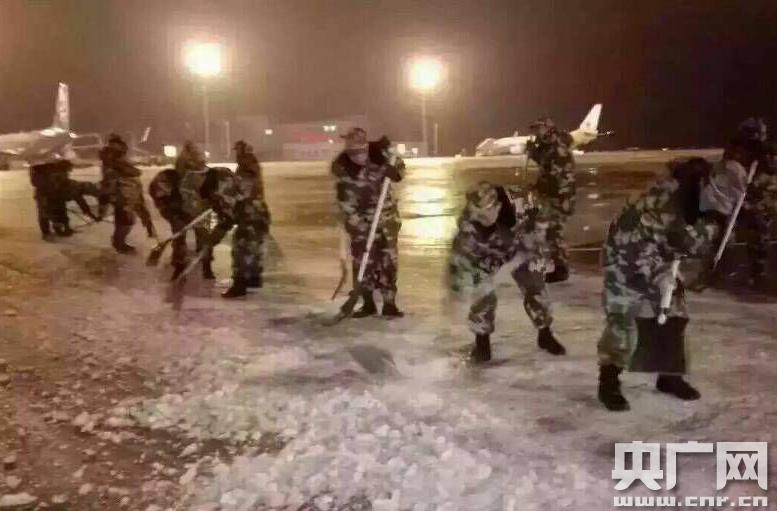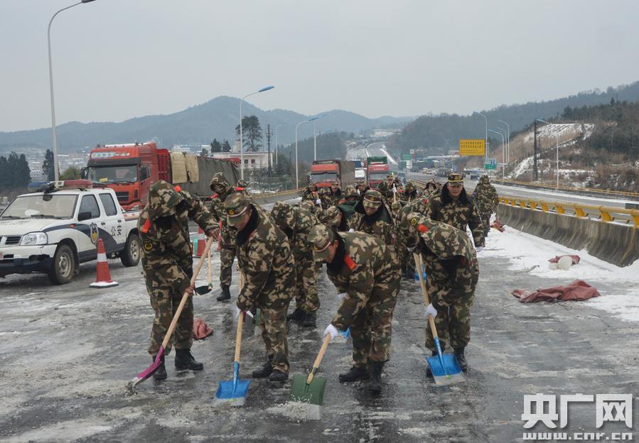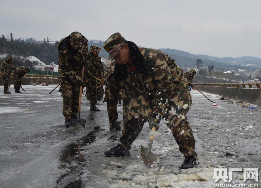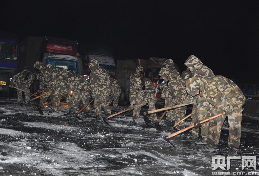 官兵們爭(zhēng)分奪秒除冰雪(攝影 龔龑?zhuān)?/p>