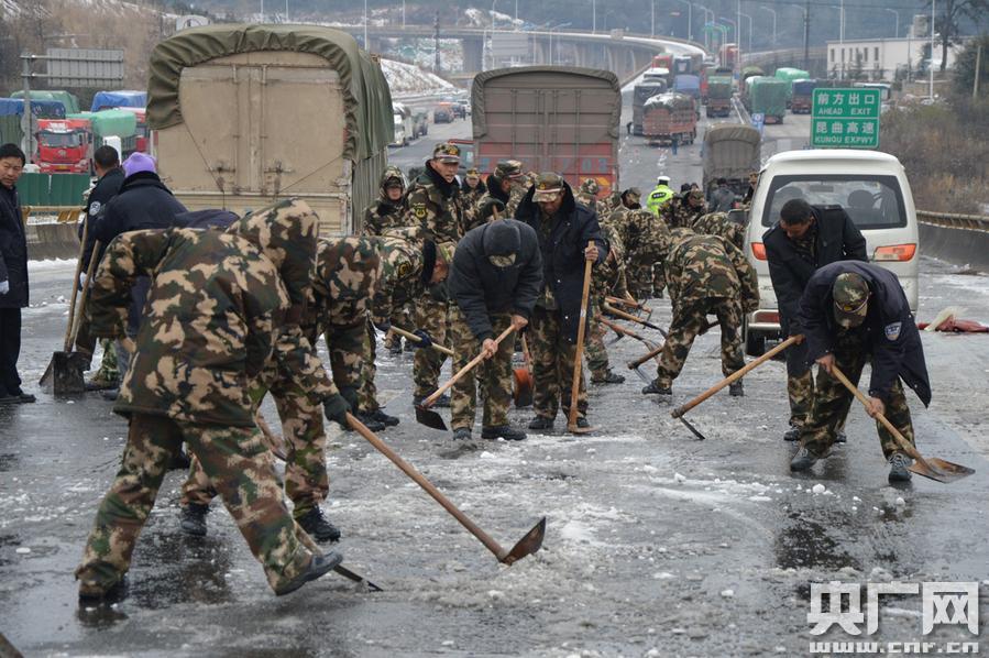 此次冷空氣來(lái)襲,導(dǎo)致昆明城區(qū)、昆曲高速、昆玉高速、昆明長(zhǎng)水國(guó)際機(jī)場(chǎng)等重要地段結(jié)冰,嚴(yán)重影響車(chē)輛正常行駛,飛機(jī)無(wú)法正常起降。1月24日以來(lái),武警昆明森林支隊(duì)立即出動(dòng)200名官兵兵分兩路火速趕赴受冰雪影響最嚴(yán)重的昆曲高速和昆明長(zhǎng)水國(guó)際機(jī)場(chǎng)除冰掃雪。