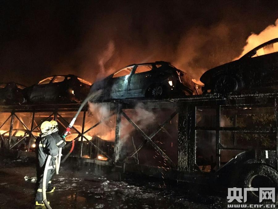 廣西岑溪一掛車起火,所載13輛轎車被毀。 (鐘德林 攝)