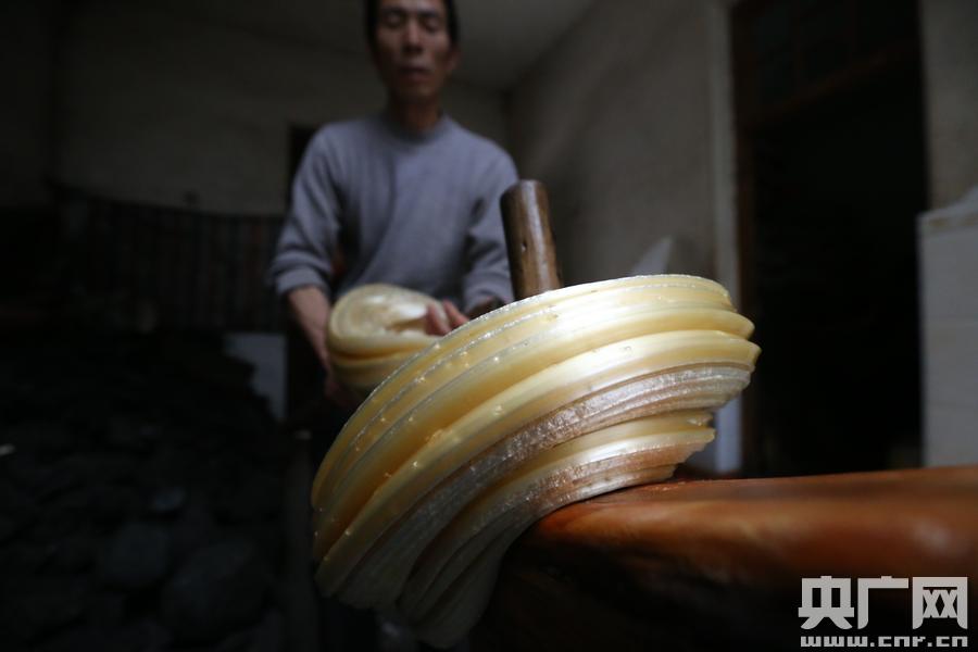 情人節(jié)的頭一天,晉寧縣晉城鎮(zhèn)回龍村丁少明家里,上百斤糙米已經(jīng)淘洗干凈。丁少明一桶一桶抄起倒進蒸籠,妻子則站在齊腰深的灶堂坑道里,鏟起一鏟子煤炭送進灶爐;饎轁u旺,直徑四尺二的鐵鍋開始往上蒸發(fā)騰騰熱氣。米飯蒸熟后,要加入麥芽糖自然發(fā)酵。經(jīng)過一段時間發(fā)酵,等米飯滲出糖水,再將糖水加熱,蒸發(fā)掉多余的水分,便成了色澤金黃的晴糖。當(dāng)晴糖冷卻至溫?zé)、柔軟程度剛好時,將其盤在木樁上不斷拉伸,重疊,再拉伸,再重疊,如此反復(fù)數(shù)次,晴糖內(nèi)充滿氣泡,色澤也從金黃變成米白。