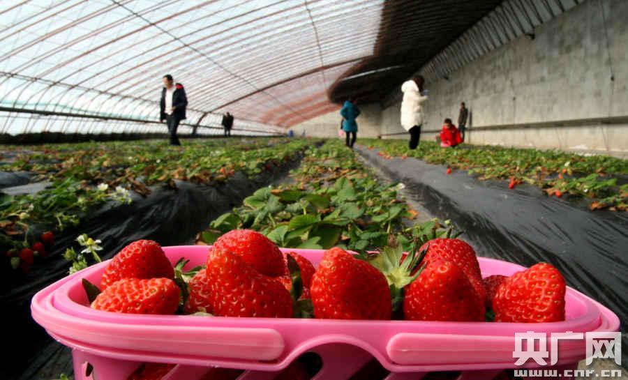 游客在草莓采摘園采摘草莓(周建玲攝)