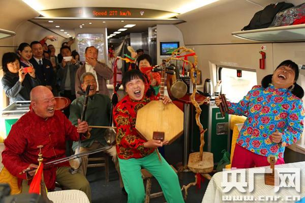 央廣網(wǎng)西安4月3日消息(記者劉濤 通訊員周博倫 張雁南)4月2日,曾參與話劇《白鹿原》演出,并參加2016年中央電視臺戲曲春晚的6位華陰老腔藝人,登上西安北至深圳北的G824次高鐵列車,為清明小長假乘坐這趟列車的旅客帶來了一場原汁原味的關(guān)中民俗視聽盛宴。
