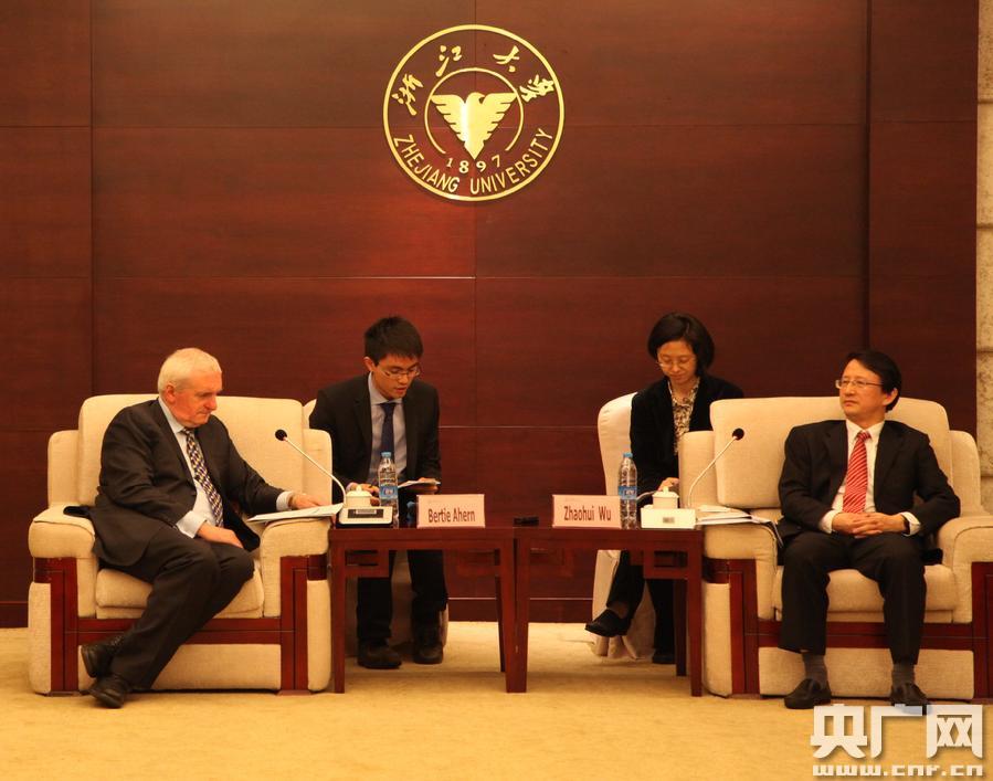 浙江大學(xué)校長吳朝暉會(huì)見國際行動(dòng)理事會(huì)聯(lián)合主席、世界領(lǐng)袖基金會(huì)會(huì)長、愛爾蘭前總理伯蒂·埃亨一行(央廣網(wǎng)記者 李佳 攝)