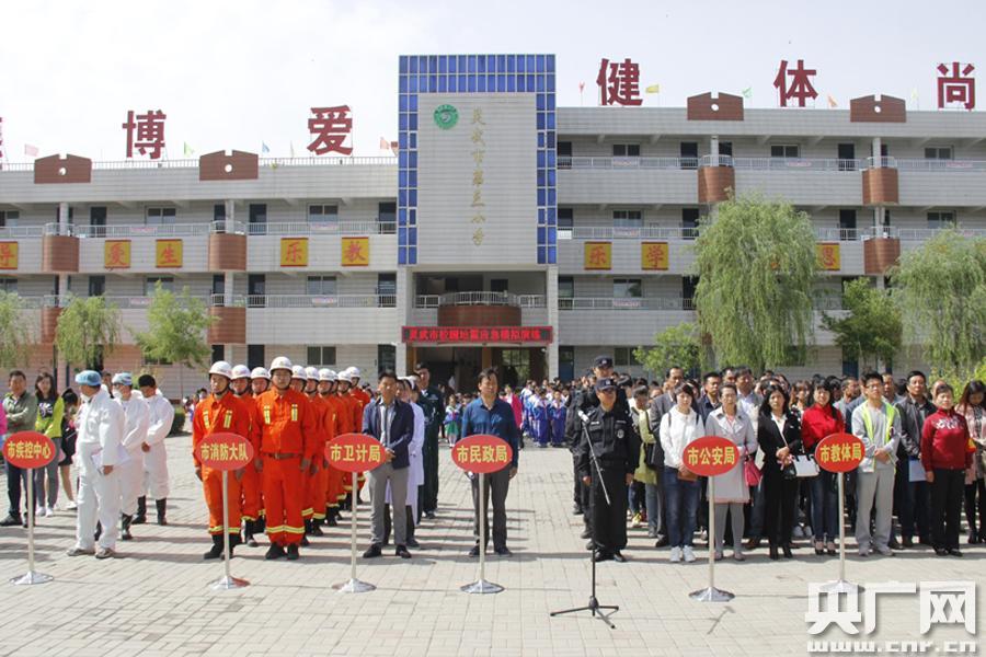 演練設定當日 9 時30分靈武市發(fā)生5.5級地震災害,震源深度約10公里,震中位于三小區(qū)域。地震發(fā)生后,靈武市第三小學立即拉響防空警報,全體教師引導學生進行緊急避震措施,同時向市政府報告。市政府立即啟動突發(fā)性災害事故應急救援預案,命令市公安、消防、安監(jiān)、地震、醫(yī)療衛(wèi)生、民政等社會應急救援聯(lián)動部門迅速火速趕赴地震災害事故現(xiàn)場。