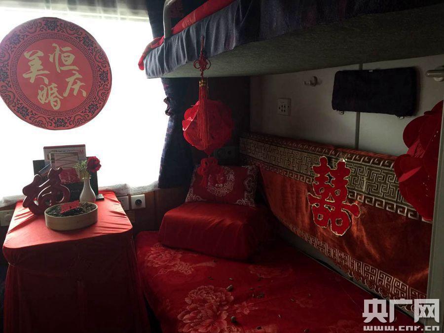 “我們?cè)谖⑿派峡匆娗岸稳兆舆@趟車上舉辦過婚禮,覺得這樣的婚禮挺個(gè)性、挺有紀(jì)念意義的,我們就商量在‘5·20’這個(gè)特別的日子里用特別的方式來記錄我們的青春!闭劶霸诹熊嚿吓e行婚禮,看著用列車包房裝扮得古色古香的婚房,新郎小張掀起了新娘的紅蓋頭。
