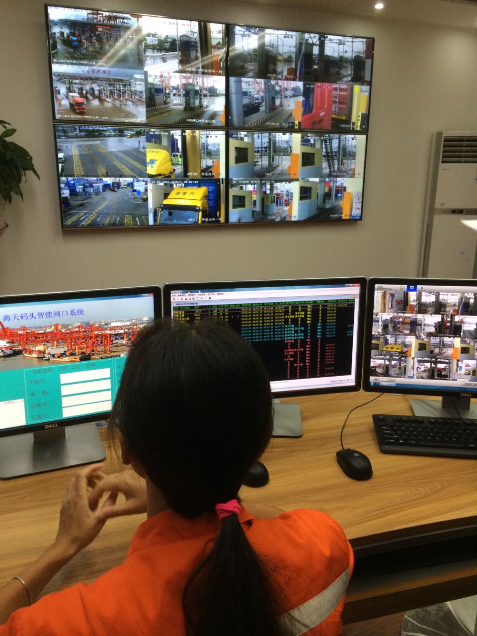 工作人員在利用廈門港集裝箱智慧物流平臺控制調(diào)度碼頭閘口箱車進(jìn)出