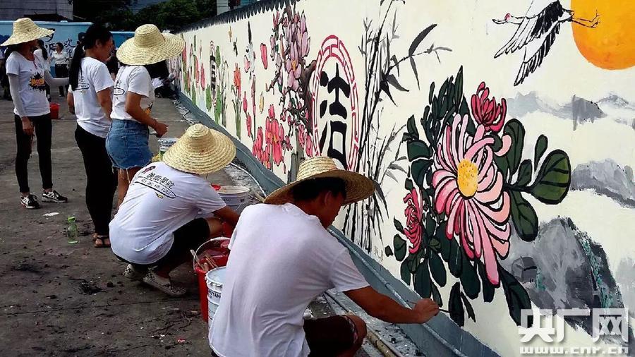 走進(jìn)四會(huì)市羅源鎮(zhèn)文化廣場(chǎng),淡雅的潑墨荷花、鮮艷的工筆紅梅、端正的廉潔書法映入眼簾,300多平方米的墻繪滿是廉政元素。而在4個(gè)月前,這堵圍墻上還空無(wú)一物。今年7月,該鎮(zhèn)聯(lián)合肇慶學(xué)院美術(shù)學(xué)院利用閑置的文化廣場(chǎng),設(shè)計(jì)、繪制了這幅巨型廉政墻繪。