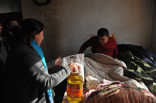 緊接著,愛心人士又馬不停蹄地來到膠西鎮(zhèn)最偏遠(yuǎn)的一個(gè)村——孝源店子村,來這里探望十多戶生活困難家庭。貧困戶王清丈夫去世不久,她一個(gè)人拉扯著兩個(gè)孩子,還要照顧智障的大哥,讓在場(chǎng)的愛心人士深受感動(dòng)。除送來的生活物品,青島君慈靈蘊(yùn)心理咨詢有限公司負(fù)責(zé)人姚麗君當(dāng)場(chǎng)掏出600元,塞到王青手里。另一位家庭生活困難的村民黃永剛,因一場(chǎng)車禍胳膊致殘失去了勞動(dòng)能力,至今仍躺在床上,本來富裕的家庭現(xiàn)在“因病返貧”。愛心人士也給他送來了家庭急需的生活物品和愛心款。