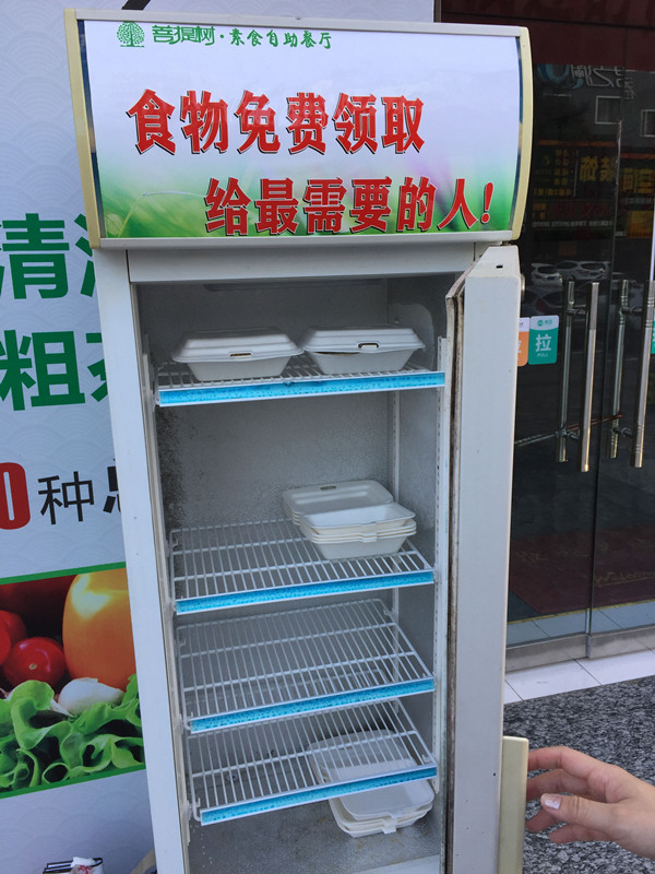 不過,鄭傳寶一直都覺得,這樣的做法并不合適。有朋友給他出主意,讓他將這些剩余的菜送給有需要的人。經(jīng)過一段時間的醞釀,餐廳專門購置了一個保鮮柜,貼上“有需要的人免費(fèi)領(lǐng)取”,把每天中午和下午兩個時段的剩余菜打包裝袋后放在保鮮柜里,再寫上放置時間和食用時間等溫馨提示,提醒拿取的人及時食用。