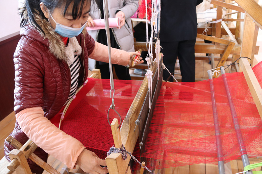 露沉村村民正在生產(chǎn)手織布。(袁璐 攝)