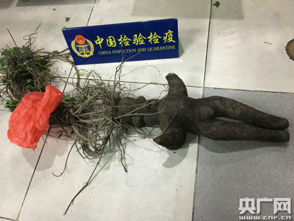 據(jù)悉,這株帶土“何首烏”長約40厘米、寬約27厘米、重為5.3公斤,外觀酷似人形,購于澳門,旅客擬攜帶入境供親人作黑發(fā)藥用。根據(jù)《中華人民共和國禁止攜帶、郵寄進(jìn)境的動(dòng)植物及其產(chǎn)品名錄》規(guī)定,有繁殖能力的植物、土壤屬于禁止進(jìn)境物品。為進(jìn)一步確定該物品攜帶病蟲害情況,檢驗(yàn)檢疫人員進(jìn)行了現(xiàn)場檢疫,在對(duì)物品塊莖解剖時(shí)發(fā)現(xiàn)該物品塊莖切面顏色偏白、質(zhì)地松脆,而真正的何首烏切面有異型維管束環(huán)列,形成云錦花紋,質(zhì)地堅(jiān)實(shí)。在進(jìn)一步解剖后,工作人員發(fā)現(xiàn)其內(nèi)部另有玄機(jī),此“何首烏”實(shí)為蓼科植物何首烏的莖藤與套模具生長的薯蕷科植物塊莖拼接而成,并非真正的何首烏,也不具備何首烏的藥用價(jià)值。