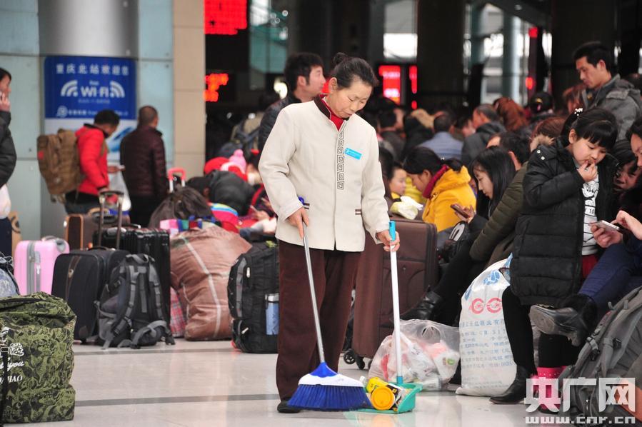 春運中的保潔員(汪亮 攝) 央廣網(wǎng)重慶2月14日消息(記者 劉湛 通訊員 汪亮)2月10日,重慶火車站發(fā)送旅客15萬人,人們背起了行囊開始了新的旅程。在人來人往的重慶火車站,有150名保潔人員工作在春運第一線,他們負責火車站的垃圾清理和保潔工作,他們辛勤的身影總是出現(xiàn)在候車室、售票廳、天橋、站臺、廁所等區(qū)域。 對于他們來說,春運已成為最為忙碌的時期,每天清理出的垃圾量是平日的數(shù)倍之多,他們默默的付出換來的是旅客干凈整潔的出行環(huán)境。春運是對出行旅客文明素質(zhì)的考驗,維護良好的乘車環(huán)境需要車站與廣大旅客共同努力,重慶火車站呼吁廣大旅客朋友把文明裝進行囊,文明出行。(汪亮攝) -