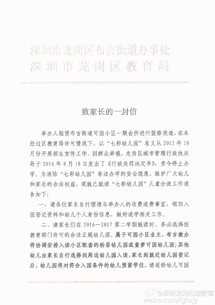 2017年1月10日,布吉街道辦、我局聯(lián)合發(fā)布《致家長的一封信》,提醒家長在2016—2017學(xué)年第二學(xué)期就讀時,務(wù)必選擇經(jīng)教育部門許可的合法正規(guī)幼兒園,并到社區(qū)工作站進(jìn)行登記,以便做好學(xué)位預(yù)留。屬于可園小區(qū)的適齡幼兒,布吉教辦將協(xié)調(diào)安排入讀小區(qū)配套的柏菲幼兒園或童夢可園幼兒園;其他適齡幼兒安排入讀就近的普惠性幼兒園。