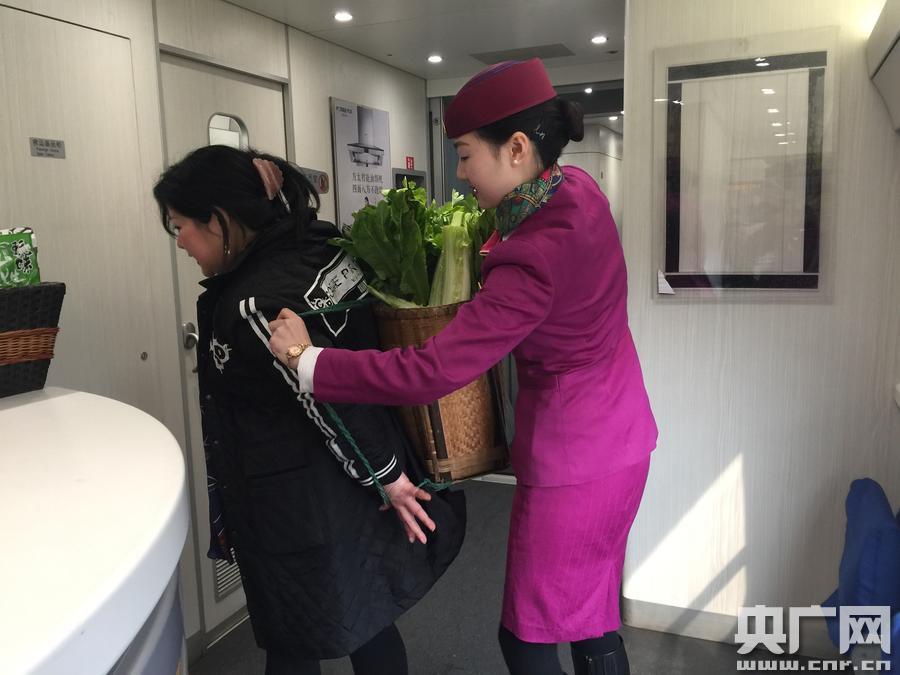 2月18日,家住資中的羅女士乘坐10點11分途經(jīng)資中北站的G8508次列車到成都看望兒子?粗龜y帶滿滿一背簍的新鮮蔬菜,乘務(wù)員立即搭手幫她取下,乘務(wù)員熱心的幫忙,讓羅女士侃侃而談!艾F(xiàn)在你們這高鐵太方便了,我以前坐大巴要兩個多小時,現(xiàn)在坐高鐵半個多小時就到了!我上午從資中買的菜,中午就可以拿到成都做午飯了,真好!”