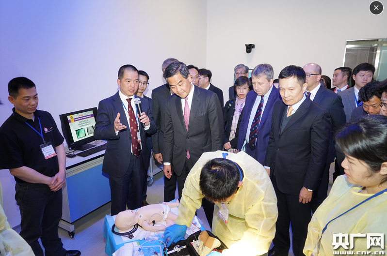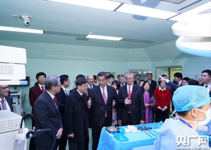 活動(dòng)儀式后,梁振英在吳以環(huán)副市長(zhǎng)和廣東省港澳辦公室主任廖京山陪同下參加了醫(yī)院,并仔細(xì)觀摩了在臨床技能模擬培訓(xùn)中心開(kāi)展的高級(jí)創(chuàng)傷生命支持(ATLS@)訓(xùn)練課程、中醫(yī)針灸推拿治療應(yīng)用中草藥配合針灸、推拿、拔罐、艾灸等傳統(tǒng)治療方法治療等過(guò)程,并參觀了醫(yī)院藥房自動(dòng)配藥裝置和藥品管理系統(tǒng)、醫(yī)院手術(shù)室二區(qū)達(dá)芬奇機(jī)器人手術(shù)間和兒科病區(qū)。他對(duì)港大深圳醫(yī)院優(yōu)美的環(huán)境和先進(jìn)設(shè)施表示贊賞,稱贊醫(yī)療服務(wù)和管理“達(dá)到國(guó)際化水平”。