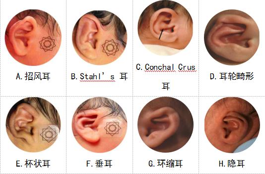 楊海弟副教授進(jìn)一步解釋說,新生兒耳廓形態(tài)畸形為胚胎期或生產(chǎn)時(shí)的外力因素所致,共有八大類型,分別為招風(fēng)耳、Stahl’s 耳、Conchal Crus 耳、耳輪畸形、杯狀耳、垂耳、環(huán)縮耳、隱耳。新生兒耳廓形態(tài)畸形常合并兩種或以上畸形,對其美觀性造成極大的影響。這些都是可以進(jìn)行矯正的類型。