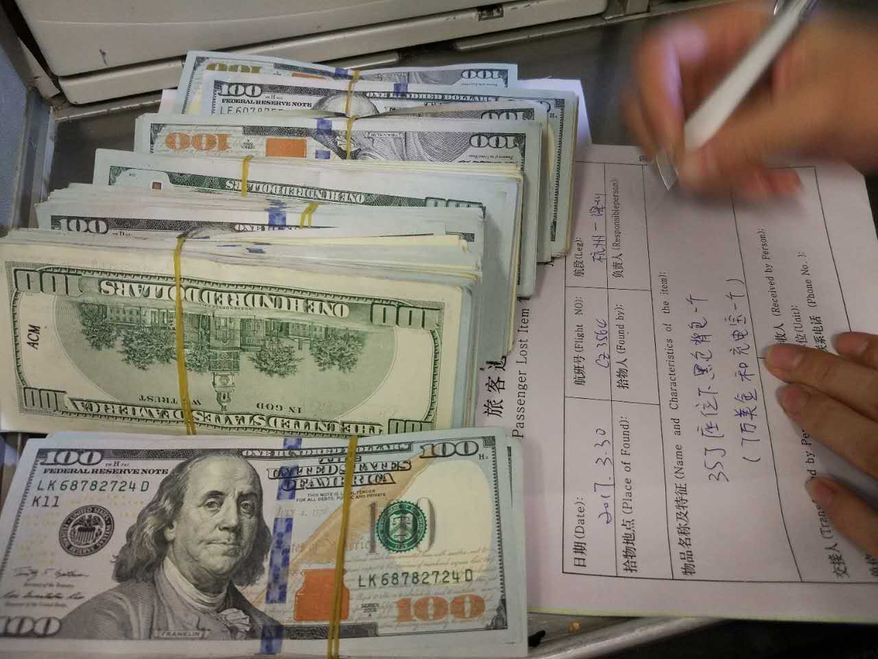 央廣網(wǎng)深圳3月31日消息(記者李強(qiáng) 通訊員孫海英 秦蓉 劉永濤)3月30日,南航CZ3564杭州飛深圳航班上,乘務(wù)組撿到7萬(wàn)美金和30萬(wàn)人民幣,共計(jì)80多萬(wàn)現(xiàn)金,從撿到現(xiàn)金到歸還現(xiàn)金,只用了短短半小時(shí)時(shí)間,最終80萬(wàn)現(xiàn)金完好無(wú)損交還給旅客。