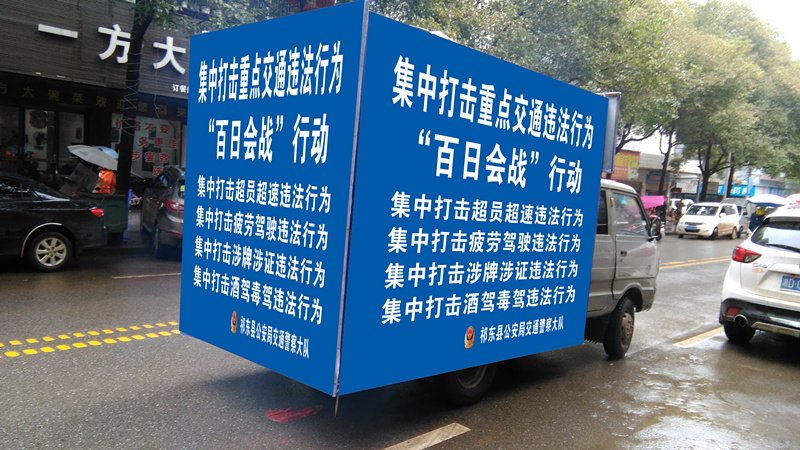 央廣網(wǎng)長沙4月27日消息(記者鄧文輝 通訊員屈金生)在集中整治交通違法行為“百日會(huì)戰(zhàn)”中,湖南祁東縣公安局交警大隊(duì)安排一輛帶有視頻或喇叭等播放設(shè)備的湘警6298警車和租用農(nóng)用車作宣傳車,以縣城、鄉(xiāng)鎮(zhèn)趕集、農(nóng)村廟會(huì)趕場、民俗活動(dòng)、物流快遞公司、學(xué)校、國省縣道主要路口及學(xué)生上下學(xué)為重要時(shí)段進(jìn)行巡回宣傳。利用“農(nóng)村大喇叭”集中持續(xù)宣傳超員超速、疲勞駕駛、涉牌涉證、酒駕毒駕、違法載人、違法占道、無牌無證無保險(xiǎn)、農(nóng)村公路行走和乘坐超員超載車、“黑包車”等農(nóng)村常見交通違法的危害性。