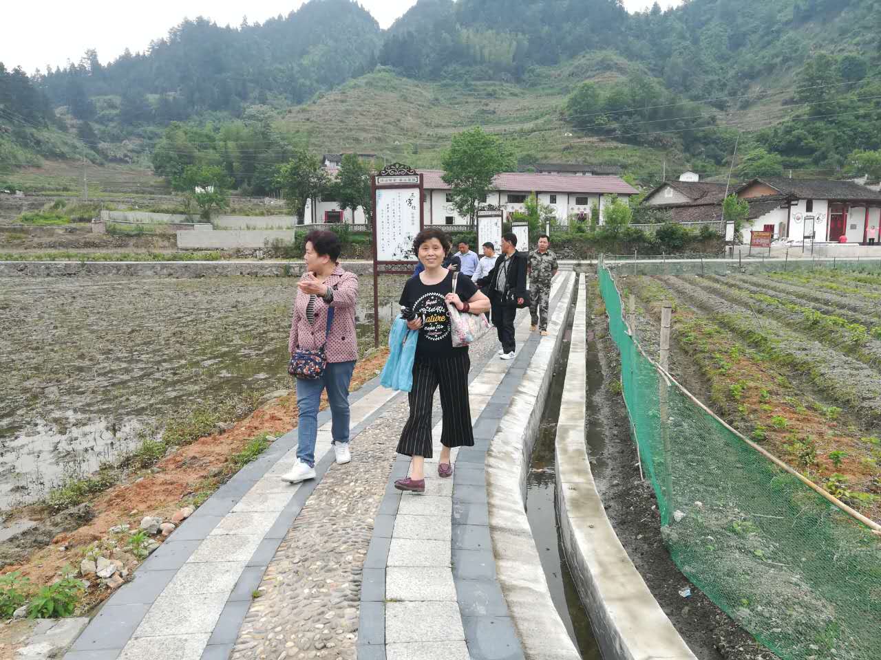 他們懷著急迫的心情,想去水口村看看,當(dāng)年他們生活和工作過的地方。走下一個(gè)陡陡的斜坡,豁然看見一個(gè)村里,有點(diǎn)封閉的世外桃源的味道。這里算是高坪鎮(zhèn)最寬敞的一塊平地啦。再見此地,老人們很快就找到了40年前的感覺,只是房子變漂亮啦!