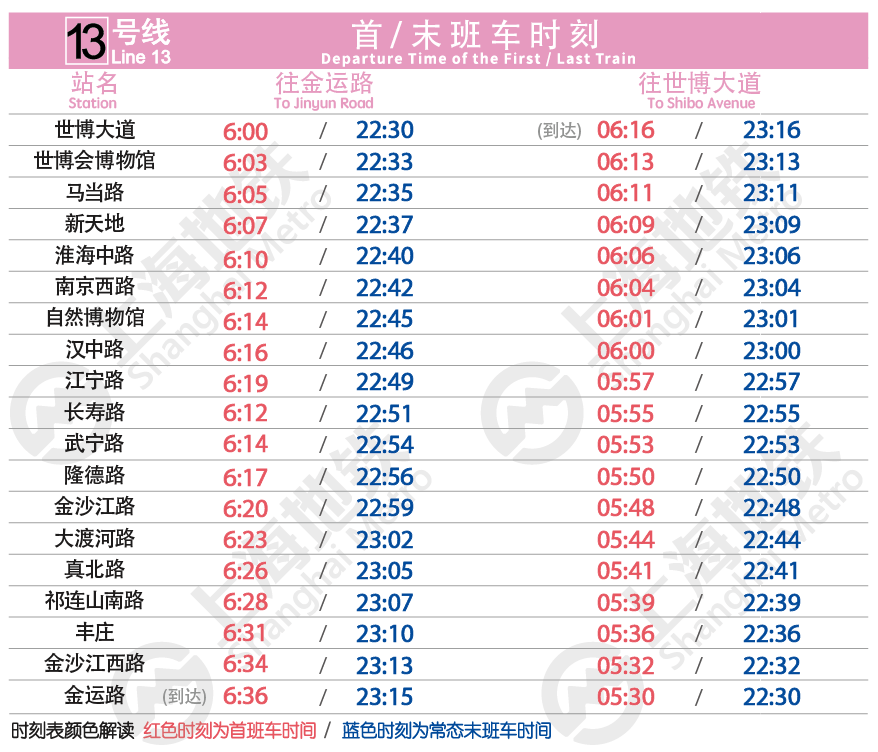 另外,針對(duì)網(wǎng)友反映的13號(hào)線末班車時(shí)間結(jié)束較早的問題,地鐵運(yùn)營方也是高度重視。5月27起,13號(hào)線延長了全天運(yùn)營時(shí)間,根據(jù)計(jì)劃:啟用新列車運(yùn)行圖后,13號(hào)線金運(yùn)路站的首末班車時(shí)間由原先的5:50和22:11,調(diào)整為5:30和22:30,調(diào)整后金運(yùn)路往世博大道方向全天運(yùn)營時(shí)間增加39分鐘;而13號(hào)線世博大道站的首班車時(shí)間維持在6:00不變,末班車時(shí)間由原先的22:08調(diào)整為22:30,調(diào)整后世博大道往金運(yùn)路方向全天運(yùn)營時(shí)間增加了22分鐘。