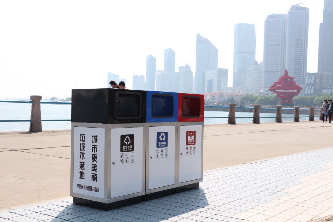 青島市市南區(qū)城市管理局工作人員王慶臣介紹說,按照全市市容市貌專項整治活動統(tǒng)一部署,市南區(qū)對轄區(qū)缺角少棱、缺桶少桶、缺株少綠的市政、環(huán)衛(wèi)、綠化設施進行了全面排查、全面整治。此次在前海一線新更換的垃圾桶,在設計上更加注重美觀和實用,做到因地制宜、因需設置。比如根據(jù)五四廣場人流密度較大特點,專門設置了大容量組合型三分類的果皮箱,包括紅色有害垃圾、藍色可回收物、灰色其它垃圾三個箱體,極大滿足游客分類投放的需求。根據(jù)大學路、山海關路歐式建筑風格特點,設置了與周邊建筑顏色相呼應的二分類果皮箱,果皮箱整體呈咖啡色,色澤亮麗美觀,箱體上中式祥云圖案與周邊歐式建筑形成完美融合。棧橋海水浴場、正陽關路人行道較窄,故設置占地小的二分類果皮箱,果皮箱整體呈弧線設計,以金黃色與天藍色相搭配,不僅滿足了游客投放需求,還為沿海環(huán)境增添一抹靚麗色彩。