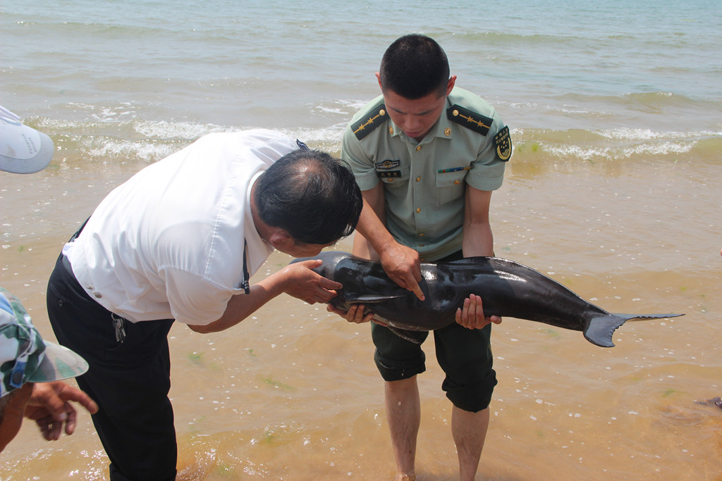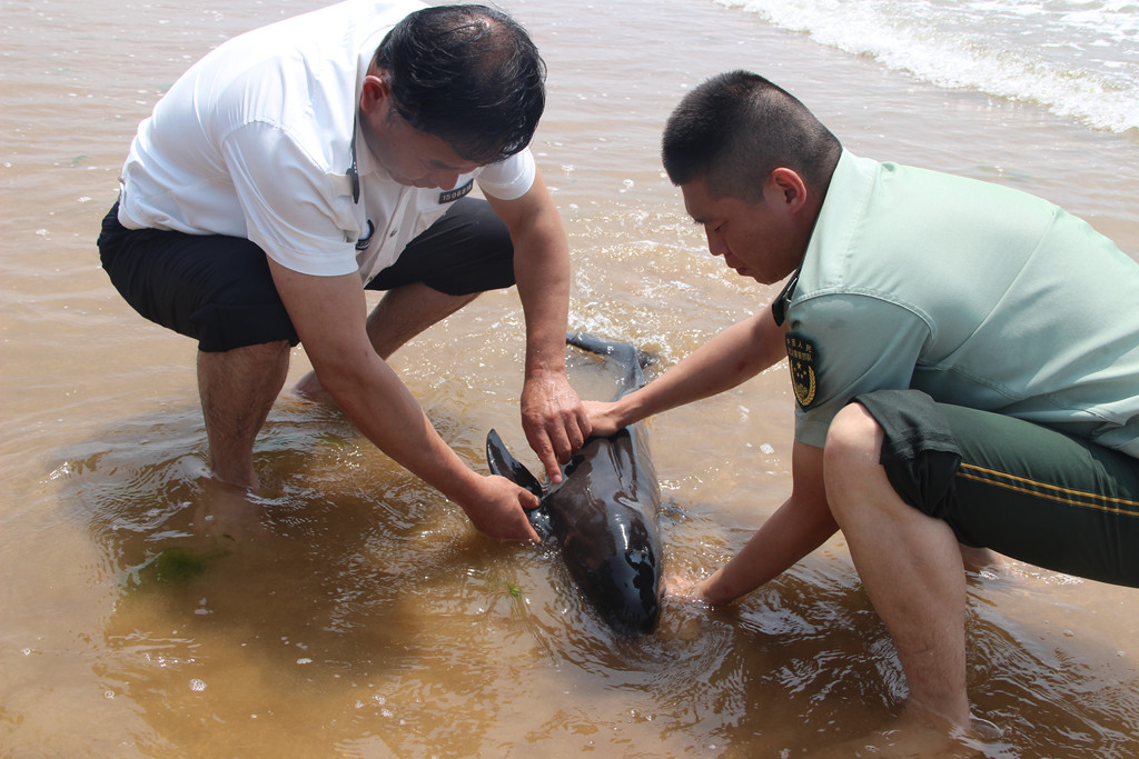 據(jù)介紹,漁民在大辛家附近海域發(fā)現(xiàn)該江豚時,因長時間的擱淺和強紫外線照射,江豚已難以動彈。經(jīng)過相關(guān)救援人員的初步檢查和判斷,這頭江豚體長約1米5,大概一歲左右,身上有輕微的擦傷,但是不會對健康造成影響,符合放生基本條件。對此,派出所民警聯(lián)合海陽漁政工作人員協(xié)力將江豚拖進大海放生。