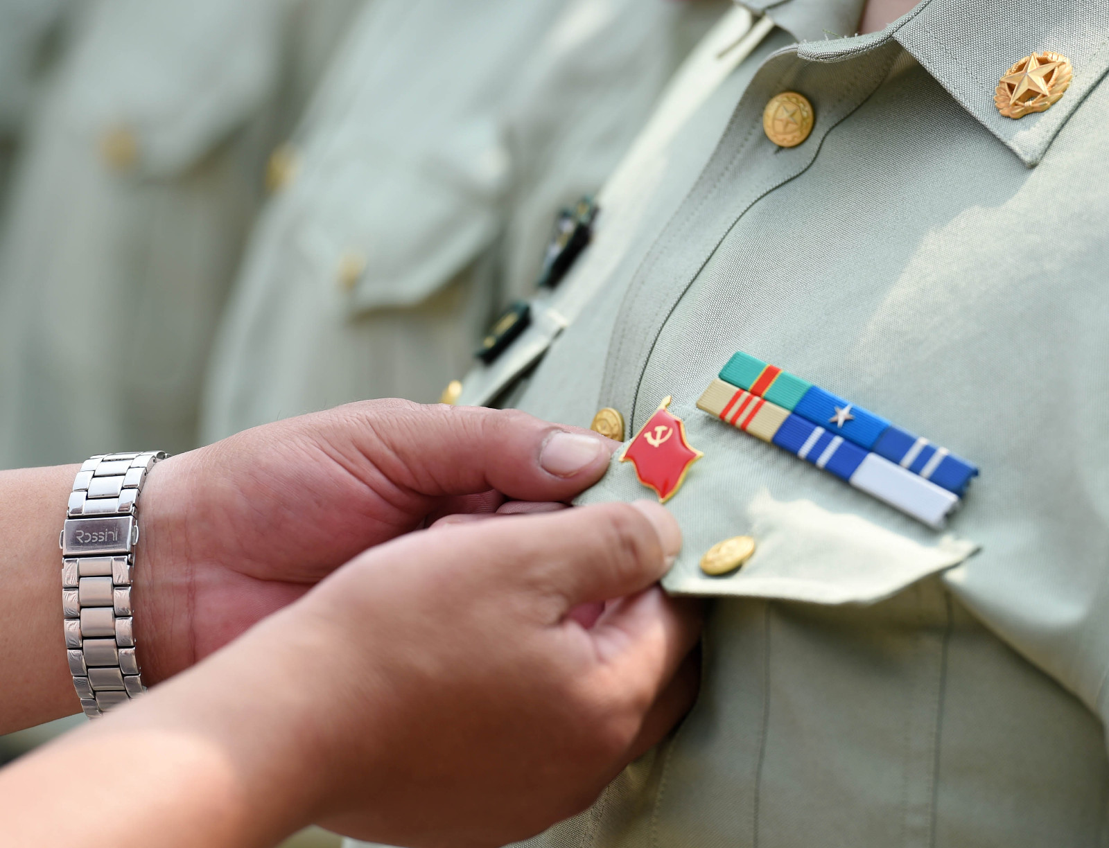 6月30日,在煙臺山革命烈士紀念碑旁,30年黨齡的李國榮老黨員給新入黨的邊防戰(zhàn)士佩戴黨徽。