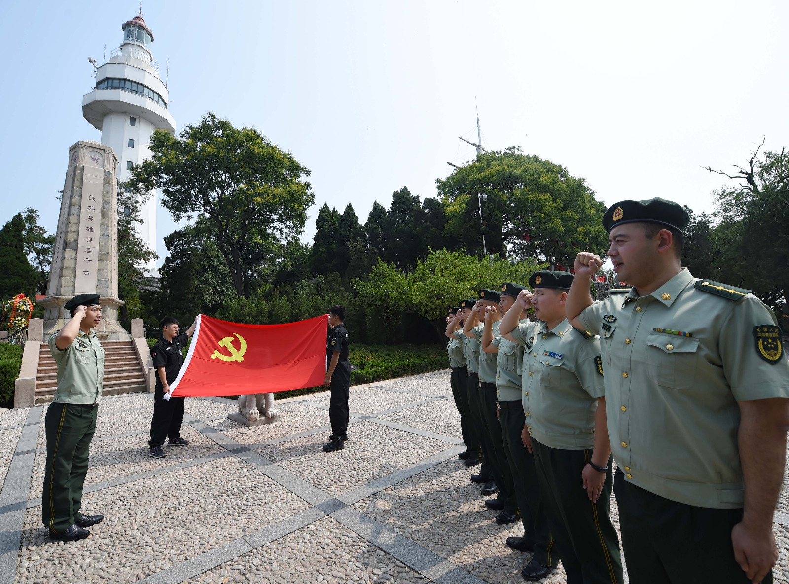 6月30日,山東煙臺公安邊防支隊官兵在煙臺山革命烈士紀念碑前重溫入黨誓詞。