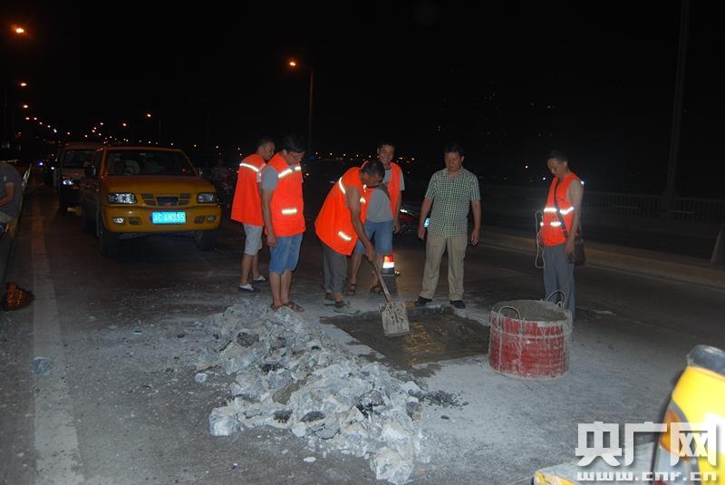 江津長江大橋已建成20年,是江津區(qū)市民出行的主要通道之一。由于車流量大、建成時間久,橋面陸續(xù)出現(xiàn)多處坑凼,形成了安全隱患。江津區(qū)公路養(yǎng)護(hù)段施工隊連續(xù)奮戰(zhàn)3個夜晚,全面完成了橋面修復(fù)工程。