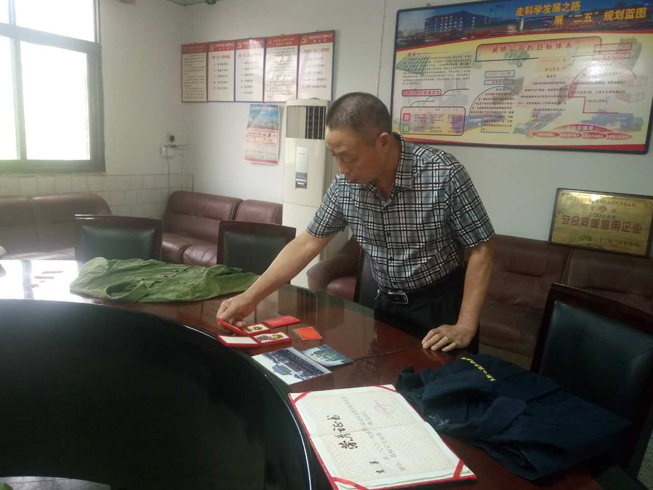 該退伍士兵榮譽(yù)室位于吳橋建材公司廠區(qū)辦公樓內(nèi),李德高倡導(dǎo)辦退伍士兵榮譽(yù)室的想法得到了當(dāng)?shù)仉p擁辦、村組以及軍民共建先進(jìn)單位的支持,更得到了20余名退役士兵的積極響應(yīng)。大家紛紛把自己從軍路上具有紀(jì)念意義的舊軍裝、優(yōu)秀士兵勛章、退役士兵證書、軍用水壺等軍用品以及轉(zhuǎn)業(yè)、退伍到地方曾經(jīng)工作過(guò)的勞保手套、獎(jiǎng)狀、照片等交到了老人的手里。
