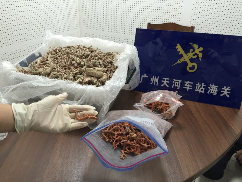 據(jù)悉,日前在廣州天河?xùn)|站廣九直通車進(jìn)境通道,一名神情緊張、步履匆忙的男子引起海關(guān)關(guān)員的注意。海關(guān)關(guān)員在這名旅客行李中發(fā)現(xiàn)一個(gè)大箱子,用膠帶包裹得嚴(yán)嚴(yán)實(shí)實(shí)。打開后,箱內(nèi)是珊瑚狀物品,呈深淺不一的紅色,散發(fā)出濃濃的海腥味。該男子聲稱這些材料為普通石頭,用于魚缸裝飾。經(jīng)中國科學(xué)院南海海洋研究所及華南野生動(dòng)物物種鑒定中心鑒定,箱內(nèi)珊瑚狀物品為國家一級(jí)瀕危保護(hù)動(dòng)物紅珊瑚,總重達(dá)8.05公斤,價(jià)值約300萬元。目前案件已移交緝私部門處理。