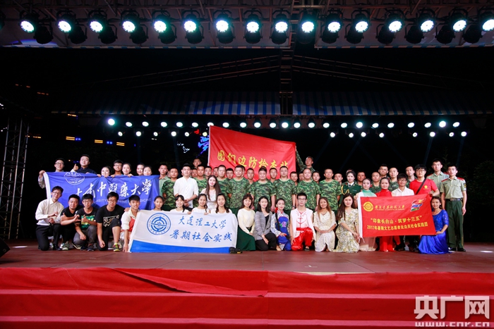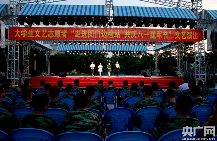 央廣網(wǎng)圖們8月1日消息(記者晁向榮 通訊員張彪)7月31日晚,大學(xué)生文藝志愿者“走進(jìn)圖們邊檢站 共慶八一建軍節(jié)”文藝演出在吉林省圖們市的圖們江廣場隆重舉行。來自甘肅中醫(yī)藥大學(xué)、大連理工大學(xué)以及西安建筑科技大學(xué)的30名大學(xué)生文藝志愿者為官兵們奉上一場精彩的演出,圖們邊檢站、延邊邊防支隊機(jī)動大隊二中隊官兵及駐地群眾共計500余人觀看演出。