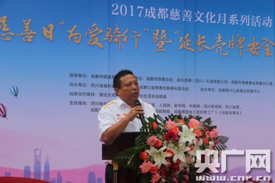 成都市民政局副巡視員宋本收致辭(央廣網記者 韓民權 攝) 央廣網9月7日消息(記者韓民權) 為愛騎行,安全護駕,傳遞大愛。9月5日,中華慈善日“為愛騎行”暨“延長殼牌安全護駕文明我先行”活動在成都舉行,4支隊伍為愛騎行15公里,為“中華慈善日”、“99公益日”開展宣傳。 成都市民政局副巡視員宋本收在活動中表示,今年“中華慈善日”,通過“綠色宣傳+慈善倡導”的公益方式吸引社會愛心人士關注,對于推動和共建“互聯(lián)網+”公益新生態(tài),多元化踐行企業(yè)社會責任,傳遞企業(yè)社會價值,動員社會力量募捐籌款,實現(xiàn)全新的跨界全民公益模式起到了積極的作用。 隨后,參與為愛騎行的全體成員在啟動儀式現(xiàn)場進行了亮相并展示隊伍口號,宋本收副巡視員同延長殼牌副總經理姚遠共同啟動騎行出征儀式。 經過近一個小時的騎行,各團隊都完成了15公里的目標。據(jù)悉,在10月下旬還將舉行一年一度的“為愛行走·成都站”活動。 活動現(xiàn)場還舉行了延長殼牌(四川)石油有限公司向成都市慈善總會捐贈儀式。 -