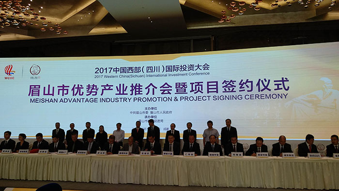 眉山市通過招商引資宣傳片、優(yōu)勢產(chǎn)業(yè)推介PPT,集中展示了眉山的比較優(yōu)勢和投資魅力。眉山市現(xiàn)場共簽約重點(diǎn)項(xiàng)目11個,總投資額296億元。其中,世界500強(qiáng)項(xiàng)目2個,合同金額180億元;10億元及以上項(xiàng)目7個,合同金額287億元。主要有由世界500強(qiáng)上海綠地集團(tuán)投資180億元,落戶洪雅縣的大峨眉國際文化旅游康養(yǎng)度假區(qū)項(xiàng)目;由北京首創(chuàng)、佛山順鉑興基投資40億元,落戶仁壽縣的鉑智匯國際創(chuàng)新引擎項(xiàng)目;江蘇麗璟投資12億元,落戶東坡區(qū)的藥品生產(chǎn)基地項(xiàng)目;西安前沿動力投資10億元,落戶金象園區(qū)的無人機(jī)零部件及整裝項(xiàng)目。此外,眉山市還引進(jìn)了以色列朱迪亞赫爾斯、華為技術(shù)有限公司、江蘇晶瑞、重慶力興投資、西安華陸集團(tuán)、浙江昱輝等一批知名企業(yè)的項(xiàng)目落戶。