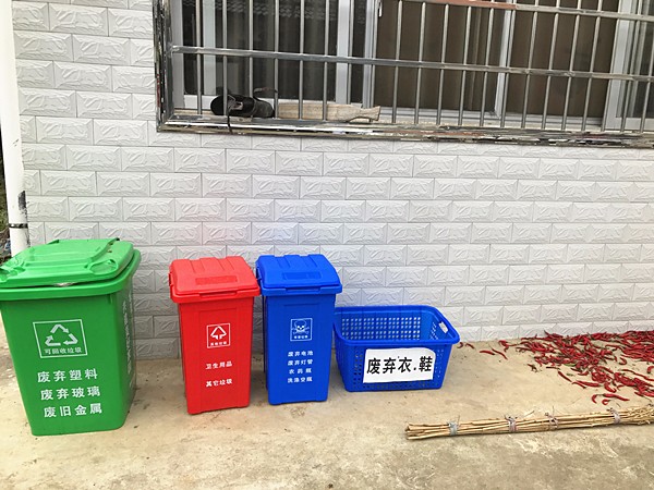 在村里每家每戶門前,都可以看到三個垃圾桶和一個回收廢棄衣服鞋子的筐。按照生活垃圾的來源、成分、結(jié)構(gòu)和處理技術(shù),分為可回收垃圾、餐余垃圾、有毒有害垃圾和其他垃圾。每戶在家門口分類后,村里統(tǒng)一進(jìn)行收集,再到鎮(zhèn)上轉(zhuǎn)運(yùn),最后到市里去集中處理。