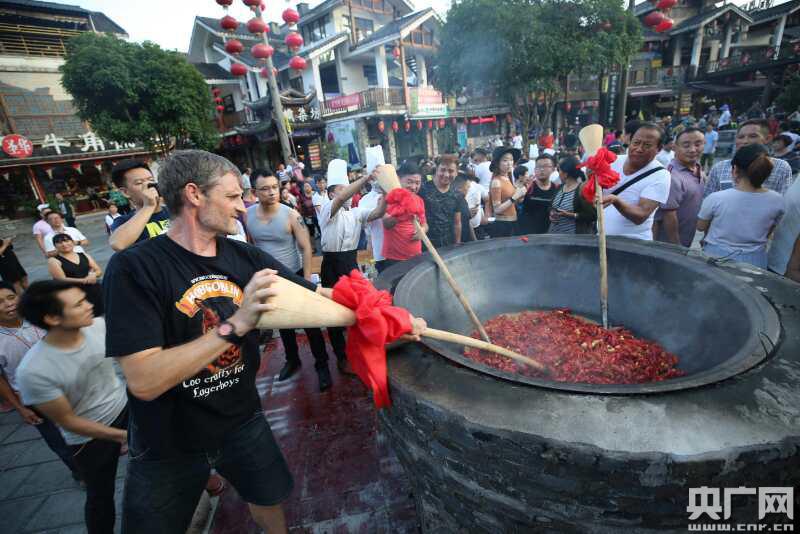 2017年9月26日,在張家界市武陵源區(qū)非遺體驗基地溪布老街民間藝人唐承剛雙腳踩在鋒利的刀刃上,徒手在直徑2米、溫度近260度的油鍋里炒龍蝦。