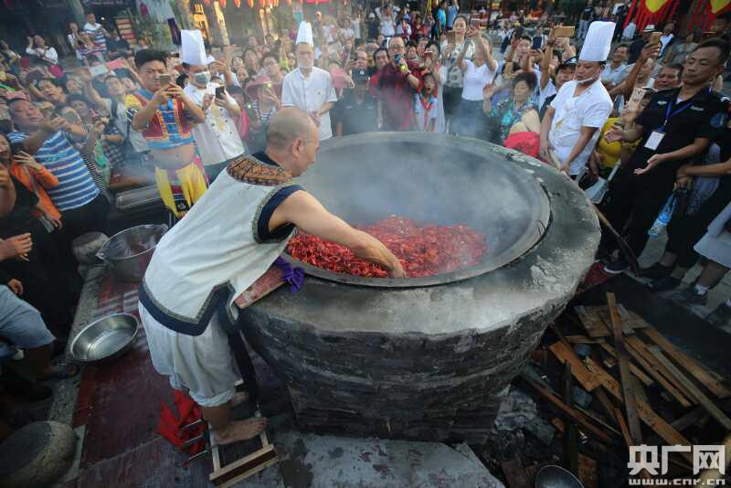 央廣網(wǎng)張家界9月28日消息(記者傅蕾 通訊員吳勇兵)9月26日,在湖南張家界市武陵源區(qū)非遺體驗基地溪布老街,當?shù)孛耖g藝人唐承剛雙腳踩在鋒利的刀刃上,徒手在直徑2米、溫度近260度的油鍋里炒龍蝦,向中外游客展示民間技藝。